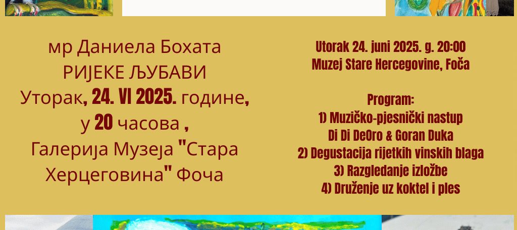 У уторак, 24. јуна у 20 часова, у Музеју Старе Херцеговине биће отворена самостална изложба слика мр Даниеле Бохата, под називом „Ријеке љубави – први плес међу сликама“. Музеј Старе Херцеговине отворио је врата мр Даниели Бохата за самосталну изложбу слика коју је назвала „Мој први… плес међу сликама“. Изложба је испреплетена додатним ауторским садржајем, […]